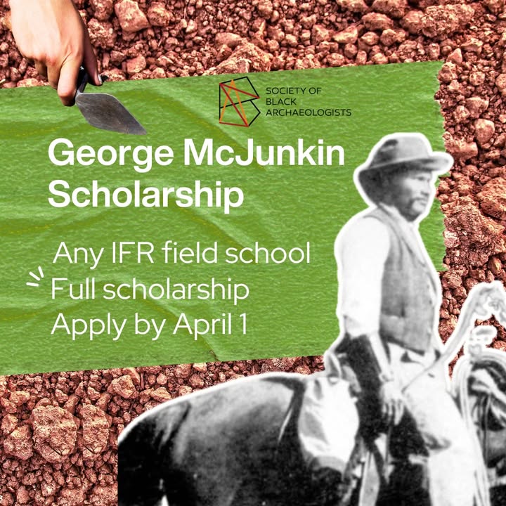 🚨 Scholarship deadline April 1 🚨 The George McJunkin Scholarship deadline is quickly approaching—don’t miss your chance to earn full funding for your IFR archaeological field school experience! George McJunkin’s discovery of the Folsom Site changed archaeology forever, proving that Indigenous Peoples had been in North America thousands of years earlier than previously thought. Although he never received recognition in his lifetime, his impact on the field is to be celebrated. This scholarship honors his legacy by supporting one student member of the Society of Black Archaeologists to attend any summer 2025 IFR field school. Learn more and apply: https://forms.gle/BySAx22UWHKgxDPw8 (fb)