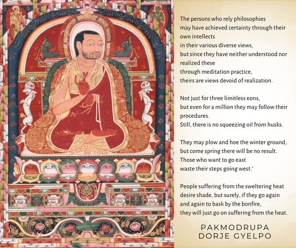 Today is the anniversary of Pakmodrupa Dorje Gyelpo (1110-1170). Pakmodrupa was a disciple of Gampopa and is one of the earliest patriarchs of the Kagyu tradition. His monastery, Densatil, which he founded in 1158, was the training ground for most of the founders of the Kagyu sub-traditions, such as Taklungtangpa and Jikten Gonpo, who went on to establish the Taklung and Drigung Kagyu, respectively. He integrated teachings that he received from Kadam, Sakya and, in vision, Zhije instructors into those he received from Gampopa. A widely learned but humble monk, he gave a clear priority to meditation over textual scholarship and philosophical reflection. Learn more in biography by Dan Martin: https://treasuryoflives.org/biographies/view/Pakmodrupa-Dorje-Gyelpo/2539 (fb)