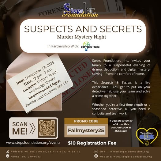 A mystery is afoot... and your family has been called to solve it. Step’s Foundation and Potter’s Touch Knowledge Center are hosting a thrilling new event: Suspects & Secrets: A Family Mystery Night 🗓 Saturday, September 13 | 🕛 12 PM – 3 PM Families will play detectives in this guided mystery experience — packed with plot twists, suspicious characters, and clues waiting to be uncovered. Each table is a team. Each clue could crack the case. No acting or costumes required — just bring your brains and your best questions. 🪑 Seats are limited. Register now at stepsfoundation.org/events Tell us: What’s the first question you’d ask a suspect? #stepsfoundationinc #samismyreason #ipledgetomakeadifference #lifeskills #osceolacounty #kissimmeeflorida #kissimmeefl #saintcloud #saintcloudfl #saintcloudflorida #stcloudfl #stcloud #stcloudflorida #poincianaflorida #poincianafl #celebrationflorida #celebrationfl #nonprofit #nonprofitorganization #MysteryNight #Suspects&Secrets (fb)