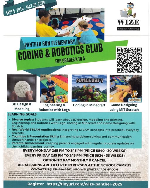 📢 Don’t forget! Registration is OPEN for the Panther Run Elementary Coding & Robotics Club 🖥️🤖 ✨ For Grades K–5 📅 Sept 5, 2025 – May 29, 2026 📍 Sessions held right on campus Students will explore: • 🧩 Engineering & Robotics with LEGO • 🎮 Coding in Minecraft • 🖌️ 3D Design & Modeling • 💡 Game Designing with MIT Scratch 🌟 Learning Goals include STEAM applications, problem-solving, and presentation skills — with regular parent updates to stay connected! ⏰ Class Options: • Mondays 2:15–3:15 PM ($840 / 30 weeks) • Fridays 2:15–3:15 PM ($924 / 33 weeks) 💳 Monthly payment & cancellation options available. 👉 Register here: https://tinyurl.com/wize-panther-2025 Questions? Contact Wize Computing Academy at 754-444-6867 or info-wel@wizeacademy.com. (fb)