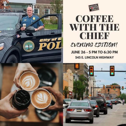 EVENING EDITION! - Join us for an evening edition of Coffee with the Chief at the Coatesville Youth Initiative! On Thursday, June 26th, from 5:00 to 6:30 PM, Coatesville Police Chief Jack Laufer will be at our office to connect with youth, families, and neighbors. This is an excellent opportunity to ask questions, share concerns, and build stronger community relationships. Location: CYI Office – 545 E. Lincoln Highway, Coatesville. It's FREE to attend and all are welcome! Coffee and light refreshments will be provided! #coffeewiththechief #coffee #CoatesvillePA #ChesterCounty #cyi (fb)