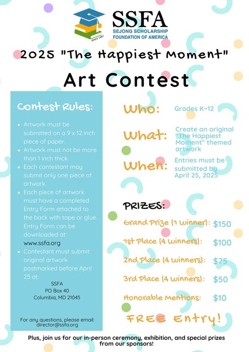 Attention young artists and dreamers! Get ready for the 4th Annual Sejong Scholarship Foundation Art Contest in 2025! This year’s theme is “The Happiest Moment.” Share a creation that captures the memory, event, or feeling that brings you the greatest joy! Key Details - Entry Deadline: Postmarked by April 25, 2025 - Theme: The Happiest Moment - Entry Fee: Free! - Prizes: Grand Prize $150, plus multiple cash awards - Ceremony Date: May 18, 2025, at Bayside Cantina (Baltimore, MD) Eligibility: K-12 students across the U.S. Categories: K–2, 3–5, 6–8, 9–12 Bring your brightest colors, biggest smiles, and best memories to life on paper! For more information or questions, visit our website or email: director@ssfa.org. We can’t wait to see how you define “The Happiest Moment!” https://www.ssfa.org/home/events#2025art-contest (fb)