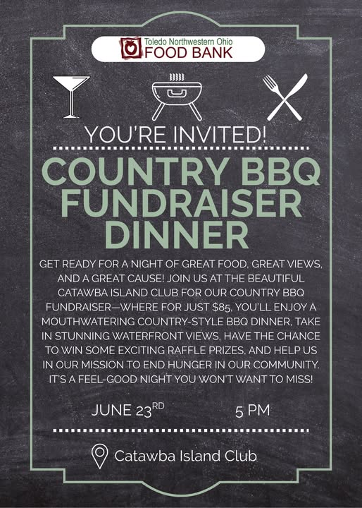 Join us at the beautiful Catawba Island Club on June 23 at 5 PM for a Country BBQ Dinner you won’t forget! Tickets are just $85 — and every dollar helps feed 5 people in our community. Support the mission. Savor the view. End hunger, one plate at a time. Get your tickets here: https://form-renderer-app.donorperfect.io/give/toledo-northwestern-ohio-food-bank/25-golf-classic-sponsorship-form-form-copy (fb)