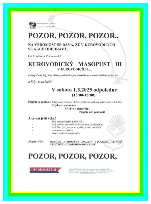 A je tady čas Masopustu🎭 ... první pozvánka od přátel z Domov Pod Skalami Kurovodice, poskytovatel sociálních služeb ... aneb přijeďte do Českého ráje🏞 ve Středočeský kraj - oficiální stránka ☀️ (fb)