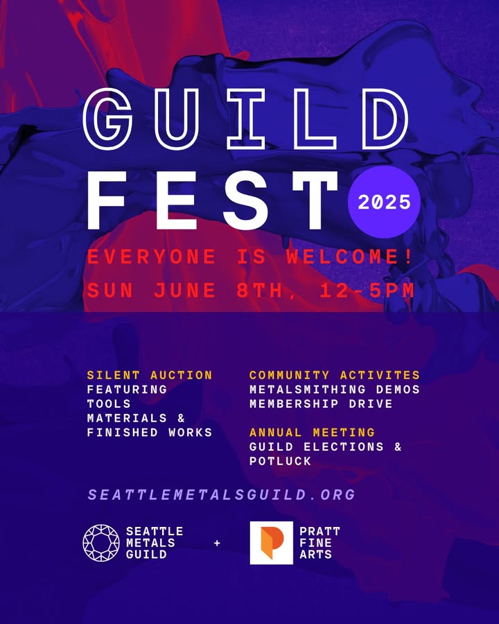In partnership with Seattle Metals Guild (SMG), we're excited to host GUILD FEST 2025 on Sunday, June 8 from 12-5pm at Pratt! GUILD FEST 2025 will feature a silent auction, metalsmithing demos and activities, a big membership drive, SMG's annual members’ meeting, and more! All are welcome 😄 Plus! On event day, registered attendees have the opportunity to receive both 50% off a Pratt Master membership + 50% off an SMG membership! For questions or concerns, please email SMG President, Christen Coomer, at president@seattlemetalsguild.org. Visit https://tinyurl.com/guildfest2025 to RSVP + view the event schedule or tap the link in our bio! See you there! ✨ #smg_guildfest ID: Guild Fest 2025 promotional graphic with event information. (fb)