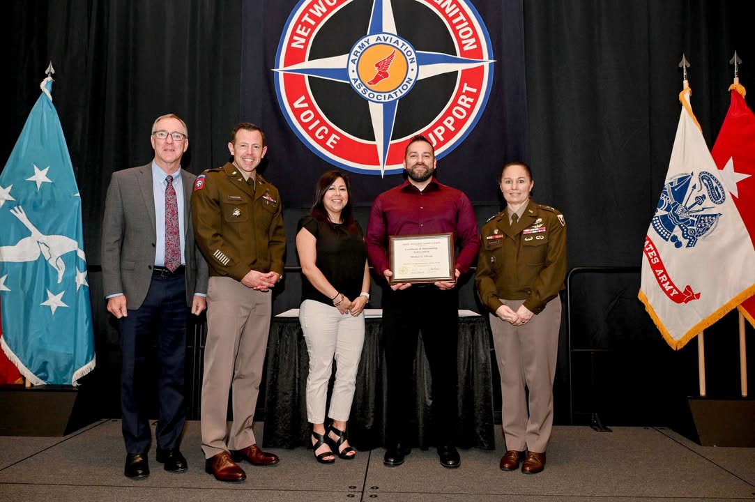 Retired Maj. Gen. Walt Davis, AAAA Executive Director, CAD Commander Col. Kevin J. Consedine. Mrs. and Mr. Michael Abrego, and Maj. Gen. Lori Robinson, commanding general of the U.S. Army Aviation and Missile Command celebrate the award. (fb)