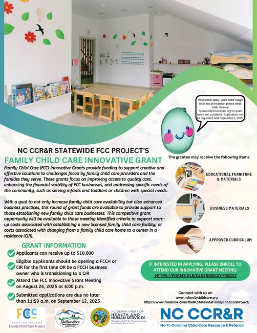 Learn more! Attend the FCC Innovative Grant Meeting tomorrow, August 26, 2025 at 6:00 p.m. https://cms.ncfamilychildcare.org/wp-content/uploads/2025/08/Family-Child-Care-Innovative-Grant-1.pdf?_gl=1*nyb70y*_gcl_dc*R0NMLjE3NTE0OTEzNzcuQ01yMWxlcU5uNDRERmNIb19RVWQxaTBrMnc.*_gcl_au*MTY1MDExNDA0OS4xNzUxOTg3NjM0 (fb)