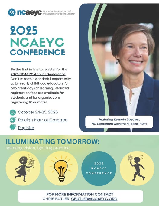 Help inspire tomorrow’s leaders by sponsoring an early childhood educator for the 2025 NCAEYC Annual Conference: Illuminating Tomorrow – Sparking Vision, Igniting Practice at the Raleigh Marriott Crabtree, October 24–25, 2025. Sponsorship Levels: • $205 – Current membership + 1 day of conference • $307 – New membership + 1 day or current membership + 2 days • $409 – New membership + 2 days • Other amount – Custom donations are welcome Bonus: You can specify the name of the educator you'd like to sponsor! Leave a comment at checkout letting us know this donation is for conference sponsorship. Let’s equip educators with the tools, strategies, and connections they need to thrive and make a difference for NC’s children, for years to come. 🔗 Donate or sponsor now through https://ncaeyc.org/donate/ . 📩 For questions: cbutler@ncaeyc.org #NCAEYC2025 #InvestInEducators #EarlyChildhoodEd #SponsorAnEducator (fb)