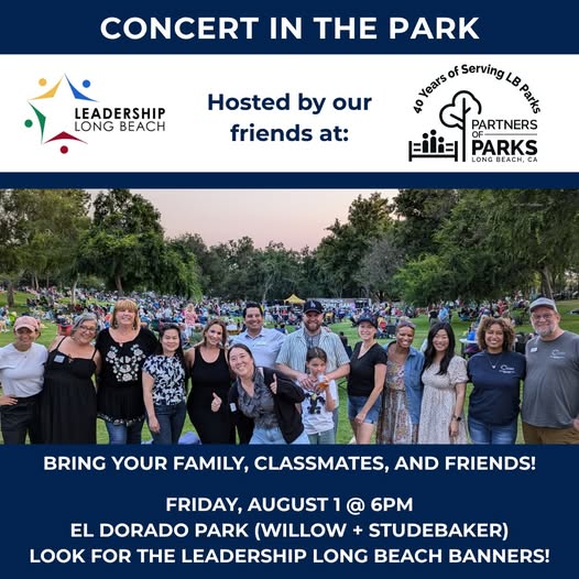 ONE DAY AWAY🎉🎉🎉 Calling all alumni: join us tomorrow, August 1, for a Concert in the Park hosted by our friends at Long Beach Partners of Parks! Bring your favorite picnic foods and enjoy this quintessential, FREE Long Beach summer event with your family, friends, and classmates! Concert begins at 6:30pm in El Dorado Park at the northeast corner of Willow and Studebaker. Partners of Parks will have some swag bags as a special treat for our attendees! No need to RSVP - just look for the Leadership Long Beach banners and stop by! (fb)