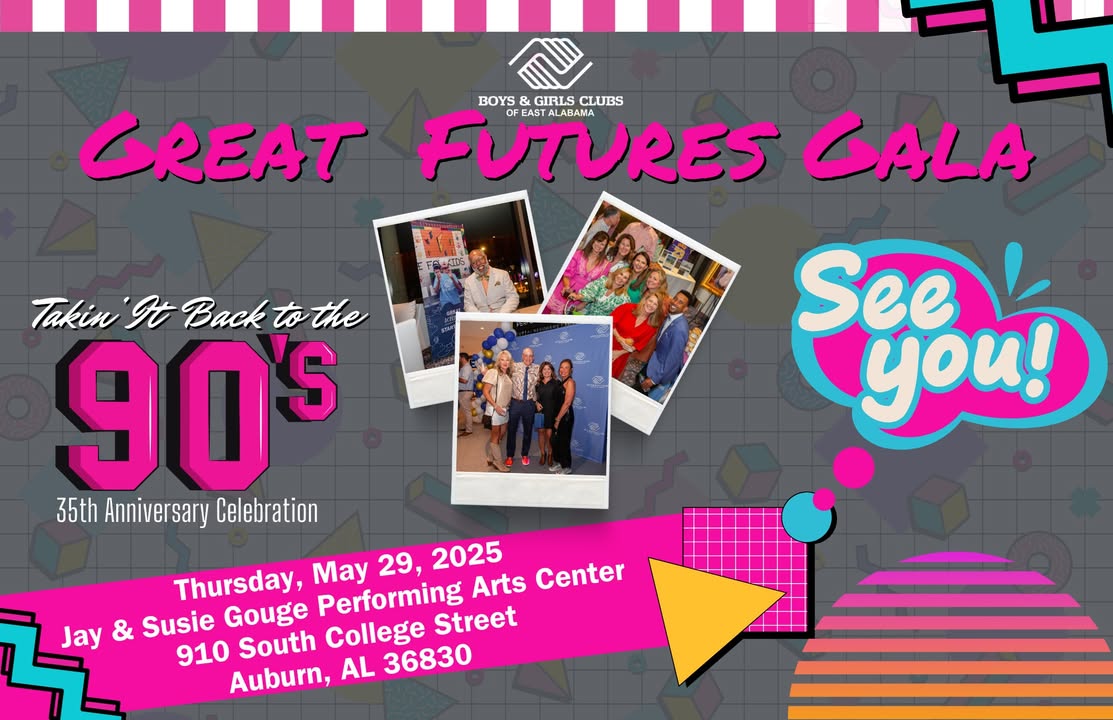 🚨 IT’S ABOUT THAT TIME! 🚨 The Annual Great Futures Gala – Takin’ It Back to the 90s officially kicks off TOMORROW and we’re ready to get jiggy with it while celebrating 35 years of impact in East Alabama! 📍 Location: Jay & Susie Gouge Performing Arts Center 910 South College Street | Auburn, AL 36830 🕕 VIP Reception: 6:00 PM 🕖 Main Event: 7:00 PM 🎧 Get ready for: 🔥 A Premier DJ droppin' the hits 🍽️ A Taste of Auburn/Opelika 🍹 Cocktails & Dancing 🕯️ Limited-edition 35th Anniversary Candle, handcrafted by our talented Club Kids – available for purchase! 👗 Dress Code: Step out in 90s-inspired fashion that’s as cool now as it was then – think denim-on-denim, pops of neon, oversized everything, and of course, a fresh pair of kicks. The vibe is bold, fun, and unapologetically 90s. We’ve put together a night where nostalgia meets purpose. And trust us, you don’t want to miss this! Come vibe with us! "A look at the past, a step toward the future: Celebrating 35 Years!" 💙HAPPY 35th ANNIVERSARY Boys & Girls Clubs of East Alabama💙 #greatfuturesgala #BGCEASTAL #35yearsstrong (fb)