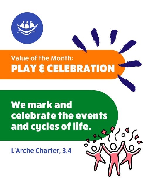 Our Value of the Month for June is PLAY & CELEBRATION! 🎉 The L'Arche Charter states, "We mark and celebrate the events and cycles of life." Our Engagement Specialist, Kyla Ponciano, shares her thoughts about what it means to be playful and celebratory: 💭 "We must play in order to disconnect ourselves from the world around. We must have fun and find reasons to celebrate life in order to reset our brains. Play is very important because it helps us grow as a community no matter the age. Play and celebration lead to better teamwork, planning, creativity, relationships and overall emotional health. Being playful helps us in so many ways, including celebrating the little moments in life as well as the big." 💭 At L'Arche, we work hard and play hard. Building an inclusive world is not easy, so it's important to let loose and take time to celebrate often. This helps build the authentic, life-giving relationships that move our mission forward. When was the last time you celebrated yourself or those around you? When was the last time you let yourself play? 🙌 ID: An orange and green graphic with the Charter quote from above and a simple illustration of three figures with confetti above. #Play #Playful #Celebrate #Celebration #Reflection #Values #Community #DisabilityInclusion #Disability (fb)