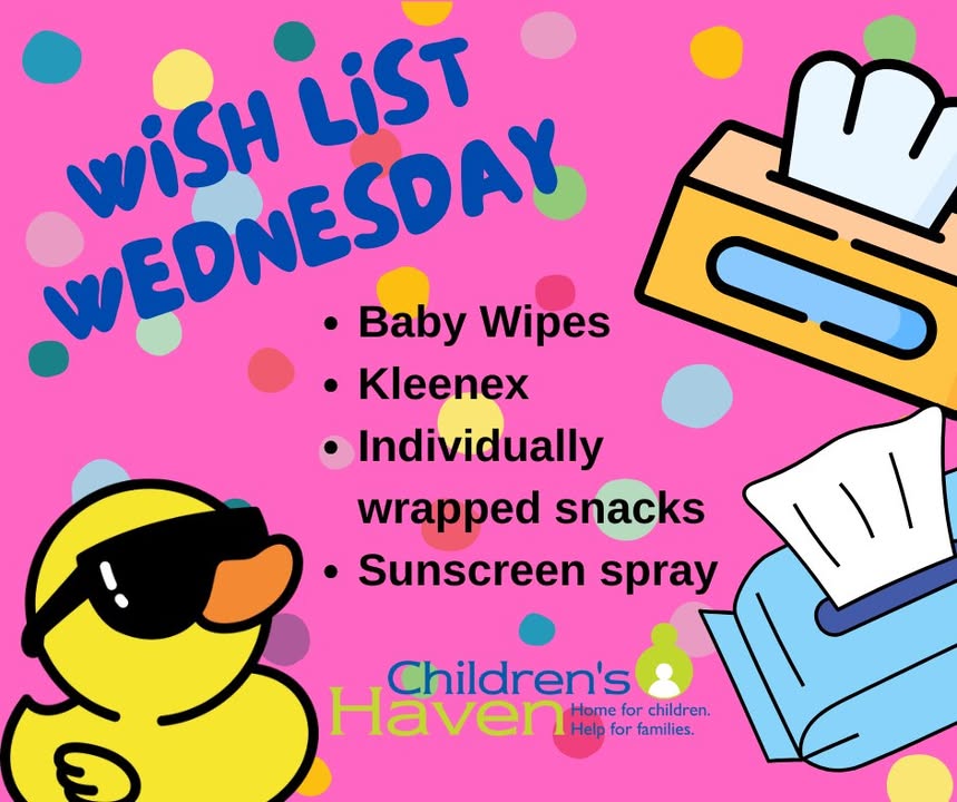 It’s #WishListWednesday, and we could use a little help restocking some important items! 🚨 Baby wipes are our emergency need right now—we’re running low and use them every day to help keep our little ones clean and comfortable. 💛 We’re also in need of individually wrapped snacks (think easy grab-and-go options!), Kleenex/tissue for those stubborn allergy noses and spray sunscreen to help protect kids during outdoor playtime. ☀️🍎 Every donation—big or small—helps us care for kids in crisis and provide a safe, nurturing environment when they need it most. Donations can be dropped off anytime at our house: 711 S. Picher. Prefer to shop online? Have items shipped directly to us or visit childrens-haven.org to make a donation. Thank you for always answering the call and helping us meet the needs of the children we serve. We’re so grateful for you! 💛 (fb)