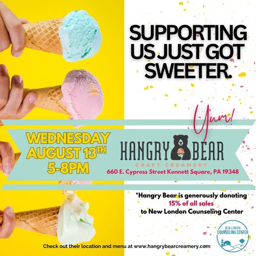 🍦✨ Supporting us just got sweeter! We’re one month away from a summer night you won’t want to miss! Join us at Hangry Bear Creamery on Wednesday, August 13th from 5–8PM, where every bite and sip supports mental health care in our community. Whether you're craving a burger, a boozy milkshake, or just a scoop (or two) of ice cream—15% of all sales during this time will be donated to New London Counseling Center. It’s a simple (and delicious) way to give back. Supporting us just got sweeter. 📍 Hangry Bear Creamery | Wednesday, August 13 | 5–8PM Check out their website for all their amazing menu items! www.hangrybearcreamery.com (fb)