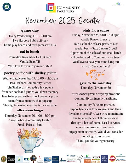 Check out the fun things we have lined up for November! November 13, 11:30 am - Out to Lunch at Vanilla Bean TH November 19, 10:00 am - Poetry Coffee with Shelley, at TH Community Center November 20, 1:00 pm - Afternoon Bingo, at TH Community Center November 28, 6:00 pm - Pints for a Cause: Community Partners Release Party, at Castle Danger Brewery (fb)