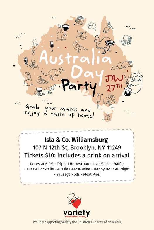Thanks to Isla and Co Williamsburg for supporting us in their upcoming Australia Day Party on Jan 27th! If you're excited to listen to Australian Music, drink Australian Cocktails, and try out a Sausage Roll or Meat Pie, then head on over to Williamsburg on January 27 from 6pm! Tickets are $10, include a drink, and you'll be supporting us and our work with Children all over New York. (fb)