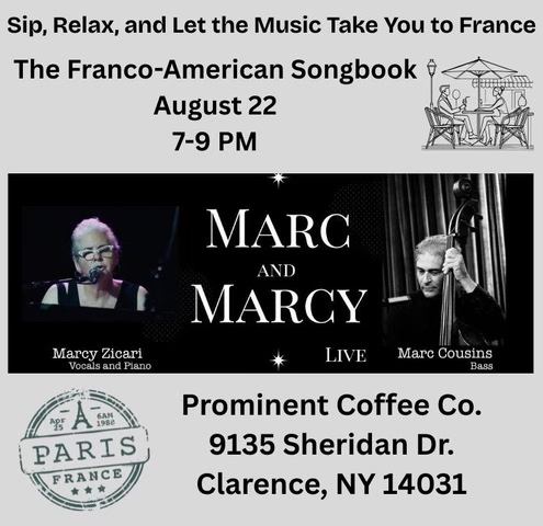 Découvrez Marc and Marcy! Marc and Marcy est un projet musical franco-américain de nos chers amis Marcy Zicari et Marc Cousins qui célèbre la richesse de la culture francophone à travers la musique. Ils interprètent un mélange de pop moderne et de classiques de la chanson française, offrant ainsi une expérience musicale à la fois actuelle et empreinte de nostalgie. Vous pouvez les voir le 22 août de 19 heures à 22 heures au Prominent Coffee Co. à Clarence (voir ci-dessous) (fb)