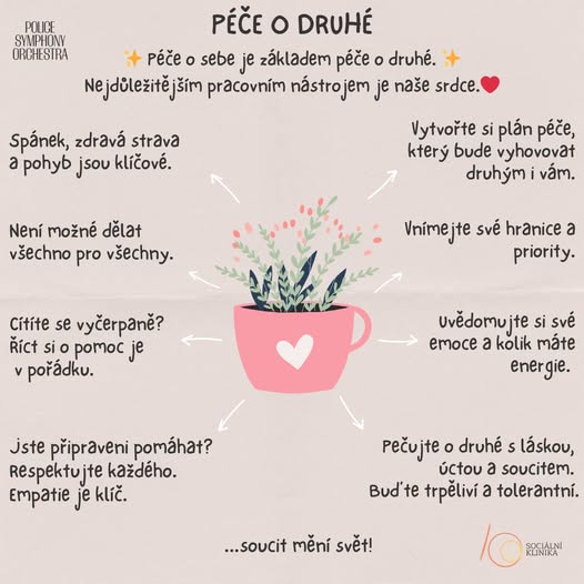 🔹 PÉČE O DRUHÉ – Další téma našeho speciálu o duševním zdraví 🔹 Pomáhat druhým je krásné a smysluplné, ale zároveň náročné. Empatie, trpělivost a porozumění jsou klíčové, ale abychom mohli skutečně efektivně pomáhat, nesmíme zapomínat na sebe. Možná vás překvapí, že prvním krokem v péči o druhé je péče o vlastní zdraví – fyzické i psychické. Jak se starat o sebe, abychom mohli být oporou pro druhé? O tom píše naše psychoterapeutka Sváťa Drlíčková v novém článku. 📖 Celý článek čtěte zde 👉 https://www.socialniklinika.cz/pece-o-druhe (fb)