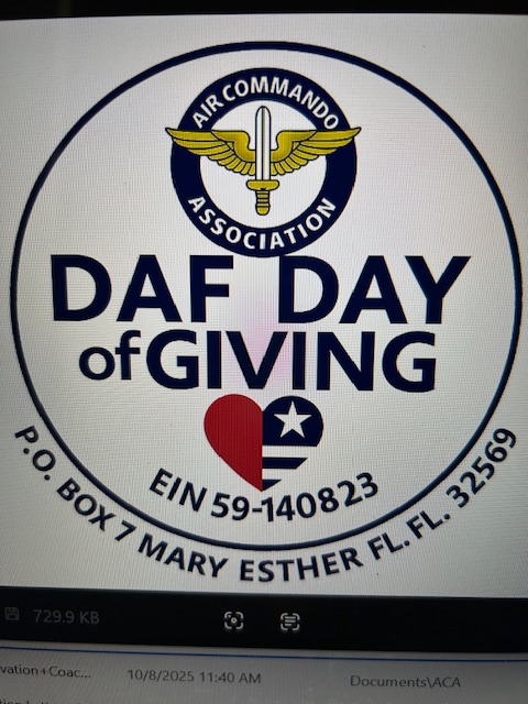 We’re proud to be part of Donor Advised Funds Giving Day – October 9th! As Treasurer of the Air Commando Association, I’m excited to share that we’re joining this national movement to make a difference through donor-advised funds. This is your chance to support the men and women of Air Force Special Operations Command — quiet professionals who serve with courage, sacrifice, and honor. 💙 Your gift helps us: • Care for Air Commando families • Preserve their legacy • Support those still serving If you have a donor-advised fund, please consider recommending a grant to the Air Commando Association. Let’s make this Giving Day count. Together, we can honor those who give so much for our freedom. Please mail checks to the Air Commando Association, P.O. Box 7 Mary Esther FL 32569. #DonorAdvisedFunds #GivingDay #AirCommandoAssociation #AFSOC #HonorTheLegacy #SupportSpecialOperations #VeteransSupport #MilitaryCharity Julie Crutchfield Treasurer, Air Commando Association (fb)