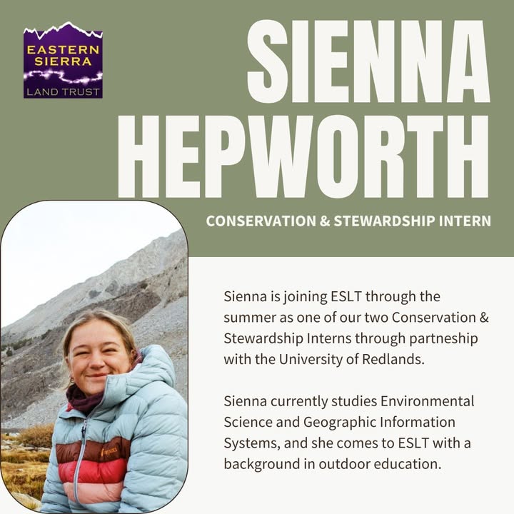 Please join us in welcoming our first Conservation & Stewardship Intern for the summer, Sienna Hepworth! As a junior at the University of Redlands Sienna studies Environmental Science and Geographic Information Systems (GIS). Through the summer, Sienna will assist in implementing both our Stewardship and Community Connections programs, engaging at each level of conservation work in the Eastern Sierra. We are thrilled to have Sienna join our team — make sure you say hi if you see her out and about at future events! Learn more about Sienna and the rest of our staff at https://eslt.org/staff-board/ (fb)