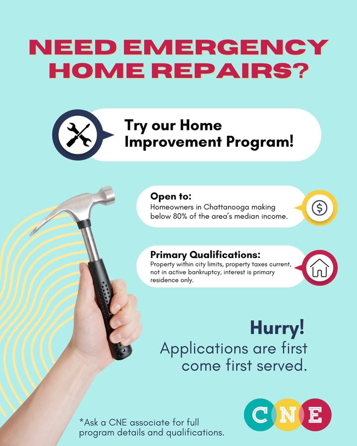 🔨 Need emergency home repairs? 🏠 Try our Home Improvement Program! Open to homeowners in Chattanooga making below 80% of the area's median income. Primary qualifications: Property within city limits, property taxes current, not in active bankruptcy, interest is primary residence only. Hurry! Applications are first-come, first-served. 🌟 For more information, visit: https://www.cneinc.org/ 🌟 (fb)