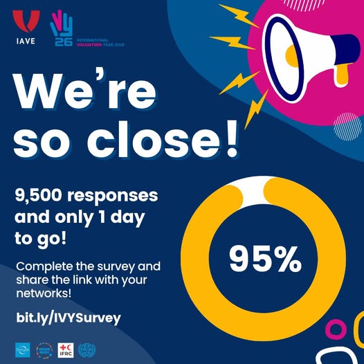 We’re almost there! Over 9,500 people from around the world have already taken the Global Survey—and we’re just 500 responses away from reaching our goal of 10,000 voices for volunteering. But here’s the catch: there’s only ONE day left to add your voice. This is your chance to shape the future of volunteering—what support is needed, what challenges exist, and what action is most urgent. Your insights will directly inform the Call to Action for the Future of Volunteering, a global roadmap for change led by volunteer leaders like you. Here's how you can help: 1. Take the survey 2. Then share the link widely—with your networks, colleagues, friends, and followers. Every single response brings us closer. Let’s hit 10,000 together. Let’s make volunteering stronger, safer, and more impactful—everywhere. https://www.surveymonkey.com/r/P9SJXP6 #GlobalSurvey #FutureofVolunteering #IVY2026 #Lastchance #Changemakers (fb)