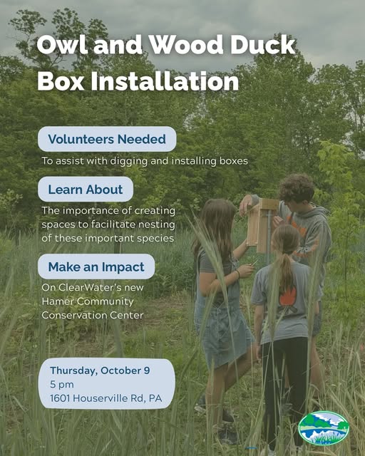 🦉🌿 Volunteer Opportunity! Join us at ClearWater’s Hamer Community Conservation Center to help install owl and wood duck boxes and learn why these nesting spaces matter! 📅 Thursday, October 9 🕔 5 PM 📍 1601 Houserville Rd, PA We especially need a few folks who can dig deep in rocky soil 💪 📧 Email Isabella@clearwaterconservancy.org to sign up! (fb)