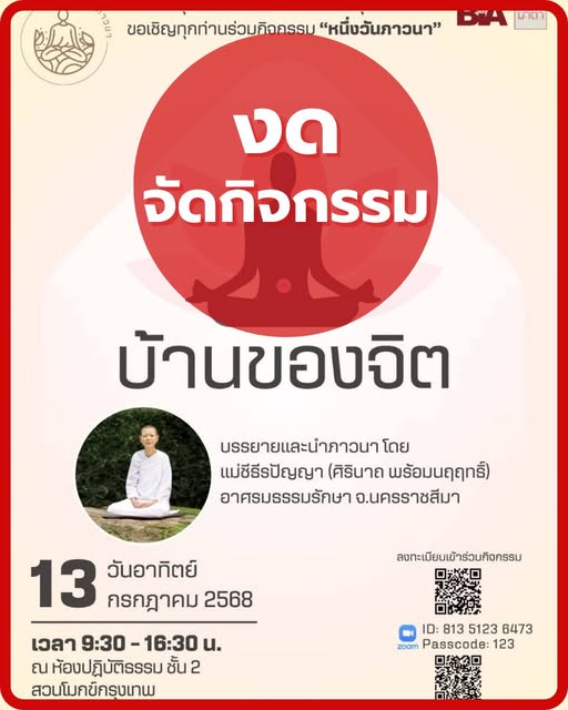 ❌ ขอแจ้งยกเลิกกิจกรรม “หนึ่งวันภาวนา” หัวข้อ “บ้านของจิต” ❌ . ซึ่งเดิมมีกำหนดจัดในวันอาทิตย์ที่ 13 กรกฎาคม 2568 เวลา 9.30 – 16.30 น. . เนื่องด้วยแม่ชีธีรปัญญา (วิทยากร) มีอาการป่วยกระทันหันและอยู่ระหว่างการพักรักษาตัว ทางทีมงานจึงใคร่ขอเรียนแจ้ง งดจัดกิจกรรมในวันดังกล่าว และขออภัยมา ณ โอกาสนี้ . สำหรับท่านที่ได้ลงทะเบียนไว้แล้ว ทางเจ้าหน้าที่จะดำเนินการยกเลิกรายชื่อให้โดยอัตโนมัติ เพื่อป้องกันผลกระทบต่อการเข้าร่วมกิจกรรมในอนาคต . 🙏 ขอขอบพระคุณทุกท่านเป็นอย่างยิ่งที่ให้ความสนใจ และขออภัยในความไม่สะดวกที่อาจเกิดขึ้นด้วยความเคารพค่ะ 🧡 (fb)