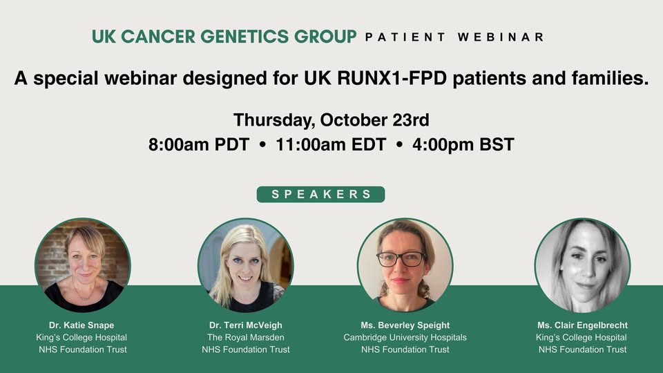 Attention UK RUNX1 Community! Join us on Wednesday, 23 October at 4:00 PM BST for a special webinar hosted by the UK Cancer Genetics Group (UKCGG). Hear from leading UK experts about the latest clinical pathways, reproductive options, and national guidelines supporting RUNX1-FPD patients and families. Reserve your spot: https://runx1researchprogram.org/fbRRPWebinarOct23 (fb)