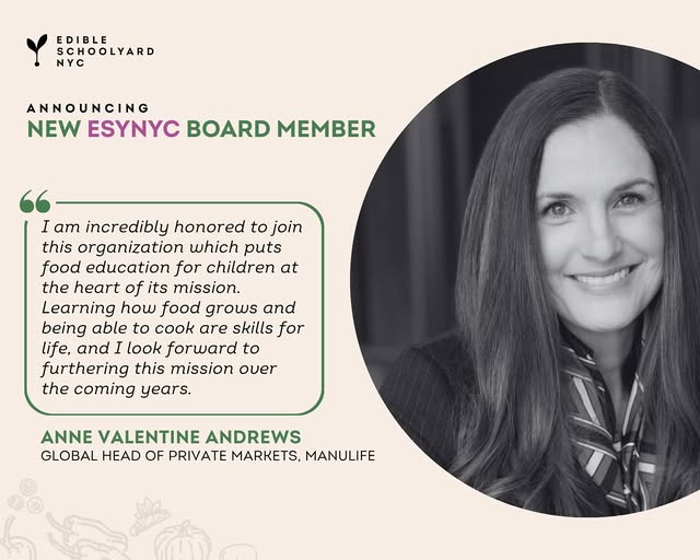 Edible Schoolyard NYC is thrilled to welcome Anne Valentine Andrews to our Board of Directors! As Global Head of Private Markets at Manulife and a passionate advocate for food education, Anne will join ESYNYC’s Board & team as we strive to provide every student with access to healthy food. 🍎 Anne is the Global Head of Private Markets, based in New York City. In this role, she’s responsible for the strategy, business development, and growth of Manulife Investment Management’s private markets business, which includes real estate, infrastructure, timber, agriculture, private equity, and credit. She also leads the private markets investment teams, bringing together the chief investment officers from each asset class in the business and working closely with the global product group to drive private markets product innovation across the institutional, retail, and retirement channels. Anne joined Manulife Investment Management from BlackRock, where she spent nine years in increasingly senior roles, most recently as Global Head of Infrastructure and Real Estate. Previously, she was Co-head and Chief Operating Officer for the Morgan Stanley infrastructure platform, and, prior to that, she was a Director at Macquarie Bank in both Melbourne and New York. (fb)