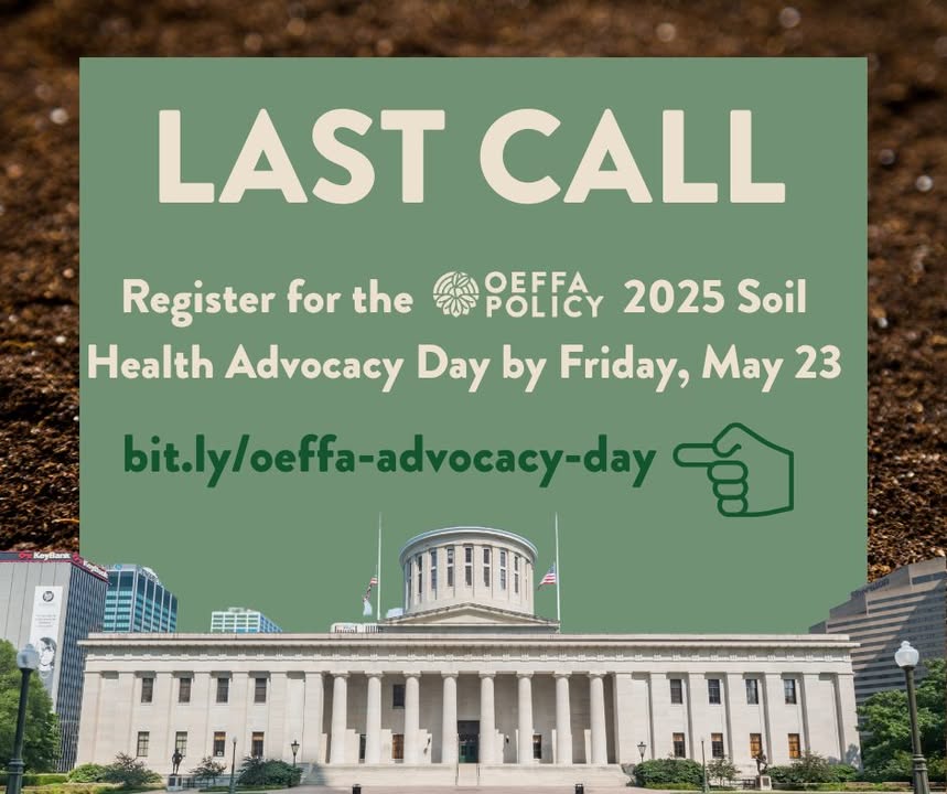 OEFFA members are invited to sign up for our Policy team's 2025 Soil Health Advocacy Day at the Ohio Statehouse on Thursday, June 12. ⚠️But do so quickly! Registration closes on Friday, May 23. Attendees will receive: ✅Advocacy training with OEFFA Policy staff ✅Tips for having effective meetings with policymakers ✅Demonstrations of different meeting scenarios ✅Information about potential soil health policies for Ohio ✅Pre-scheduled meetings with Ohio legislators ✅A light breakfast and complementary lunch There is also an optional post-advocacy day happy hour at Jackie O’s and travel stipends are available for farmers. Reach out to lauren@oeffa.org with any questions. Sign up today at at bit.ly/oeffa-advocacy-day. (fb)