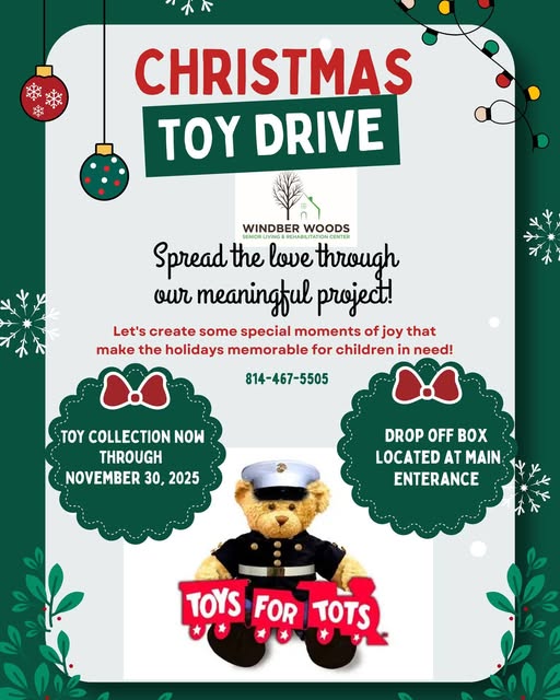 Help us spread holiday cheer at Windber Woods! 🌟 We’re proud to support Toys for Tots — collecting toys now through November 30. The drop-off box is located by the main entrance. 🎄 Join us in making the season brighter for children in need — every toy makes a difference! 🎁 #WindberWoods #ToysForTots #SeasonOfGiving #HolidaySpirit #CommunityCare #GiveBack #ChristmasJoy #SeniorLivingCommunity (fb)