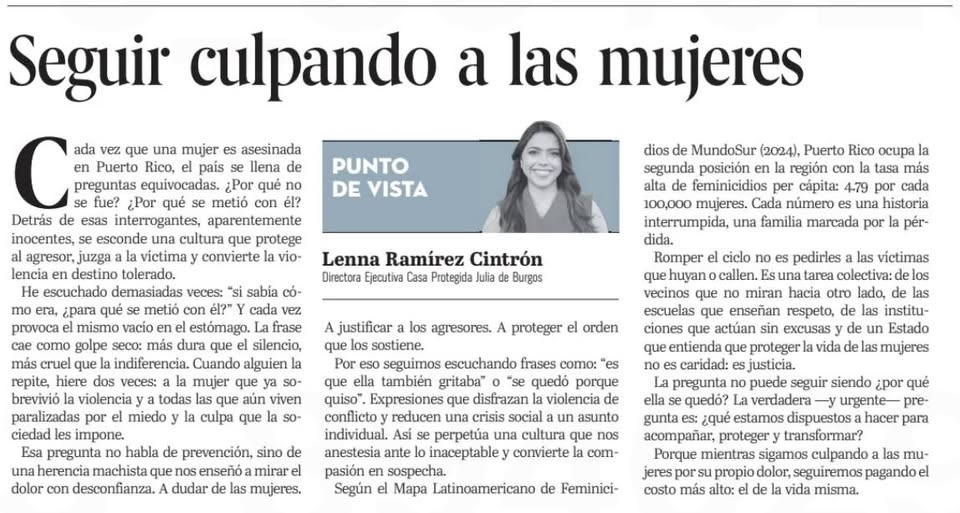📰 Hoy se publicó la columna de opinión de nuestra directora ejecutiva, Lenna Ramírez Cintrón, en la edición impresa y digital de El Nuevo Día . En su texto, Lenna reflexiona sobre cómo la cultura machista sigue culpando a las mujeres por la violencia que enfrentan, y nos invita a repensar las verdaderas preguntas que debemos hacernos como sociedad. 📖 Puedes leerla aquí: https://www.elnuevodia.com/opinion/punto-de-vista/el-costo-de-seguir-culpando-a-las-mujeres/ #CasaJulia #ViolenciaDeGénero #Opinión (fb)
