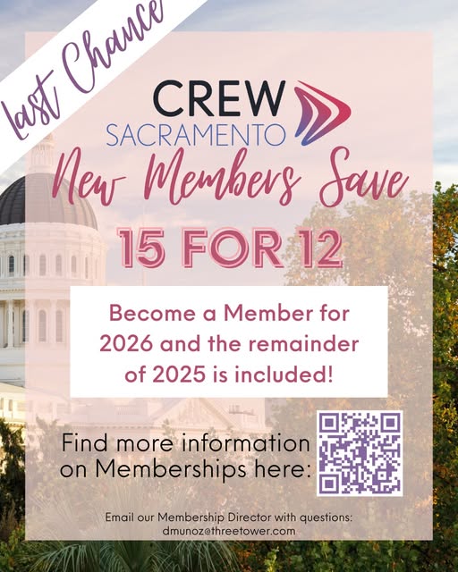 Don’t let the clock run out! Tomorrow marks the final day of the month—and your last opportunity to snag a 2026 #CREWSacto Membership with the bonus of extra months! Wrap up this year on a high note and kick off the next with the strength and support of CREW Sacramento. Join us and elevate your network to new heights! Find out more information about Memberships by visiting our website https://sacramento.crewnetwork.org/join Questions? Email our Membership Director - Debi Munoz - dmunoz@threetower.com #NewMember #JoinTheCREW (fb)
