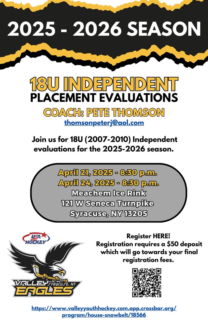 Join us for 18U Independent Evaluations! Register here: https://www.valleyyouthhockey.com.app.crossbar.org/program/house-snowbelt/18566 (fb)