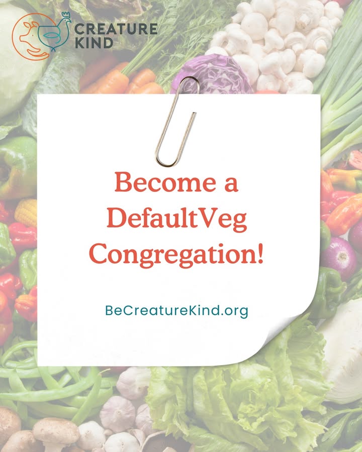 Could your church become one of the first DefaultVeg Congregations? CreatureKind is piloting a new program called DefaultVeg Congregations where we encourage local church communities to make changes towards plant-based foods in the food they serve. CreatureKind will mentor representatives from DefaultVeg Congregations in how to work for change in their local churches to align their faith commitment with the food served at church. If you or someone you know has the potential to in our first cohort of CreatureKind DefaultVeg Fellows and work for food changes in a local church, we want to hear from you. Learn more and apply to be part of the pilot program. Deadline: Earth Day, April 22 https://becreaturekind.org/take-action/defaultveg/ (fb)