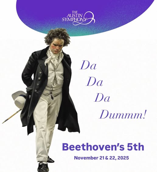🎼 Did you know: Beethoven’s 5th Symphony was so groundbreaking that audiences at its premiere were reportedly stunned into silence? Experience the suspense and power of every note as the music takes you on an unforgettable journey! 🎹✨ Join the Austin Symphony Orchestra for an unforgettable evening of music and energy: 🗓️ Fri., Nov. 21 & Sat., Nov. 22 at 8 p.m ☎️ 512-476-6064 ext. 3 📍The Long Center 🎟️ Tickets available now through the Linktree in our bio! Experience the power, passion, and genius of Beethoven live! #AustinSymphony #Beethovens5th #MasterworksSeries #LiveOrchestra #AustinEvents #ClassicalMusicLive #ATXArts (fb)