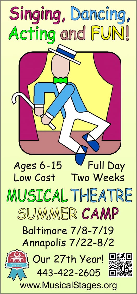 Musical Theatre Summer Camp Our 28th Year. Ages 615 Full day Two weeks Baltimore July 7 July 18 Annapolis July 21August 1 Annapolis Registration is now closed The camp is taught by musical theater professionals. The campers are assigned to small groups by age and take classes in singing dancing acting costumes and stagecraft. Learning ageappropriate songs from great Broadway shows the campers are taught healthy vocal technique develop poise and coordination through dance explore acting skills and improvisational games rehearse scenes make their costumes design and paint the backdrop.