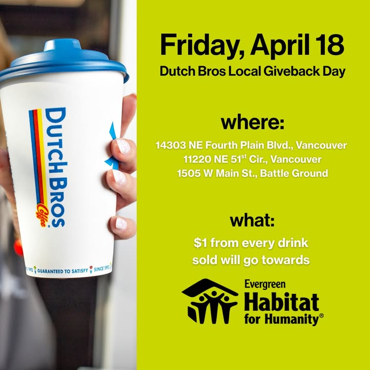 Support Evergreen Habitat with Dutch Bros ☕️ Tomorrow Dutch Bros is partnering with Evergreen Habitat for their local giveback day at participating locations! Stop by one of the three locations: 14303 NE Fourth Plain Blvd., Vancouver 11220 NE 51st Cir., Vancouver 1505 W Main St., Battle Ground $1 for every drink sold will go towards our mission here at Evergreen Habitat. (fb)
