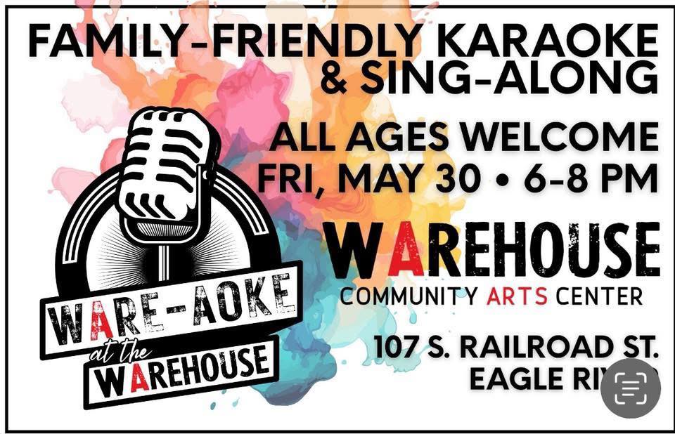 Free Karaoke this Friday! Join us this Friday from 6-8pm for family friendly public art event at the Warehouse. There is a fancy new app being used and song possibilities are endless, so bring your most favorite, fun, popular or obscure song to sing to. The Inspiration Bar will be open, serving both alcoholic and nonalcoholic choices! KARAOKE!! 🎤 Located at 107 S Railroad St in Eagle River. (fb)