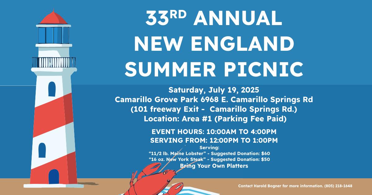 The Thirty Third Annual New England Summer Picnic in Ventura is an eagerly anticipated event that brings together community members, families, and friends for a day filled with fun, food, and fellowship. This year, the picnic will take place on Saturday, July 19th, 2025, and promises to be a highlight of the summer season. 🔗 https://www.casrf.org/event-details/the-thirty-third-annual-new-england-summer-picnic (fb)