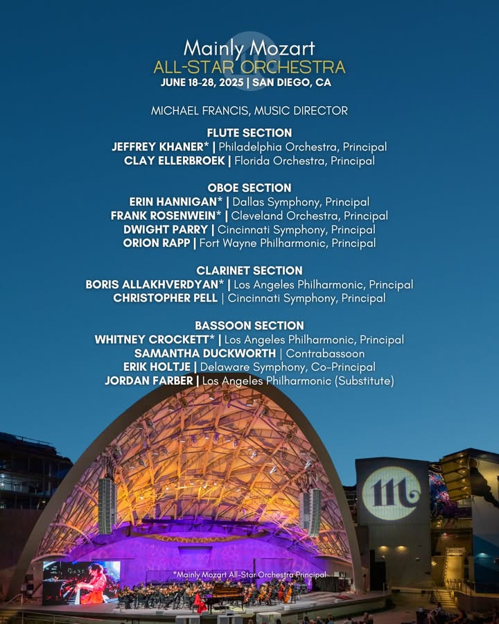 Introducing the 2025 Mainly Mozart All-Star Orchestra Festival woodwinds:notes: Jeffrey Khaner of the Philadelphia Orchestra leads the #flute section, Erin Hannigan of the Dallas Symphony and Frank Rosenwein of the Cleveland Orchestra are rotating principals of the #oboe section, Boris Allakhverdyan of the LA Phil leads the #clarinet section, and Whitney Crockett of the LA Phil leads the #bassoon section. (fb)