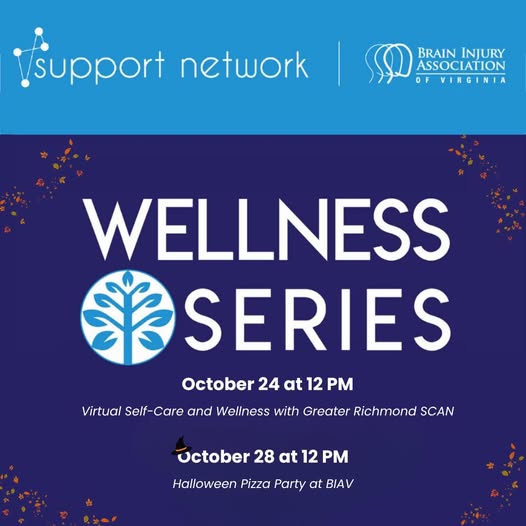 Join us starting this week for the next installments in our Fall Wellness Series! 🍁🎃 This Friday, 10/24 at 12 pm we'll be joined by Greater Richmond SCAN for an hour of self-care and wellness tips. Come relax, unwind, and learn how to prioritize yourself this fall! Register here: https://zoom.us/meeting/register/9evdXcshRpGFE_bgTVhu6A On Tuesday, 10/28 at 12 pm, join us at the BIAV office for a pizza party and time spent in community with other survivors and caregivers! We'll have refreshments and some fun costumes! 👻 RSVP here: https://forms.gle/qE6qsbD8uxFJckgy7 We're looking forward to connecting with you! #BIAV #WellnessSeries #SelfCare #CommunityImpact #BrainInjuryAwareness #SupportingSurvivors (fb)