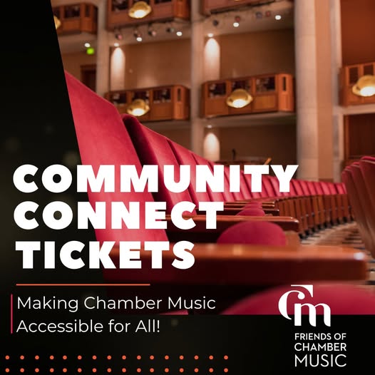 Introducing Community Connect Tickets! We believe world-class chamber music should be accessible to everyone. That’s why we’re setting aside a limited number seats for every FCM performance at the Newman Center for just $25 each! Perfect for anyone new to FCM—or anyone who needs a little extra help to attend. Limited quantity. First come, first served! Learn more at https://friendsofchambermusic.com/cct/ Ages 30 & under? Tickets are just $15 - no promo code needed! Students? Just $5! #FCMDenver #CommunityConnect #ChamberMusicForAll #ArtsAccess #DenverMusic (fb)