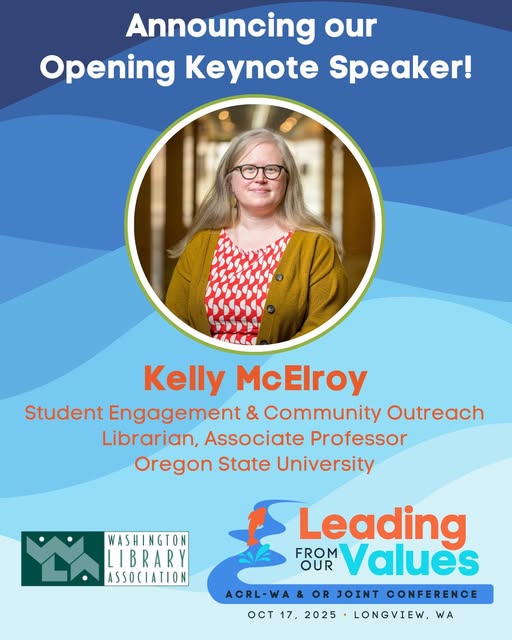 We are excited to announce that Kelly McElroy will be our opening keynote speaker for the 2025 ALD/ACRL-WA & OR Joint Conference! Early-Bird Registration ends on Wednesday, October 1, so make sure to register by then to receive this discounted rate. We'll see you on Friday, October 17 in Longview for a day full of educational, thoughtful, and collaborative sessions and conversations. Visit https://www.wla.org/2025-ald-acrl-wa-acrl-or-conference for our full program schedule and to register! (fb)