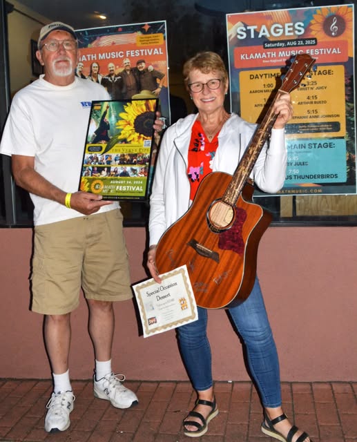 Congratulations to our raffle grand prize winner, Sherrill Hooke! Sherrill won both the autographed Verve Pipe guitar package and one of a handful of dessert packages. Many thanks to everyone who participated! Your contributions help Klamath Music pay the bills and keep the lights on. 😉 (fb)