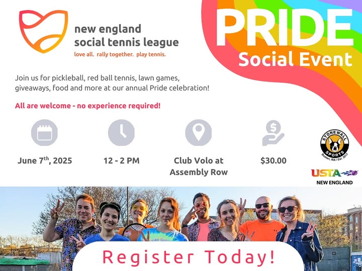Tennis4All is excited to share that our friends at USTA New England will be hosting a Pride Social Event in a couple weeks – and we’d love for you to be a part of it! Link to register is here: https://playtennis.usta.com/NESocialTennisLeague/Coaching/Session/5563bc69-d1d1-4305-b265-152ba6a1700e Join USTA New England for an afternoon of red ball tennis, pickleball, lawn games, delicious food, and friends – all in celebration of Pride and community. (fb)