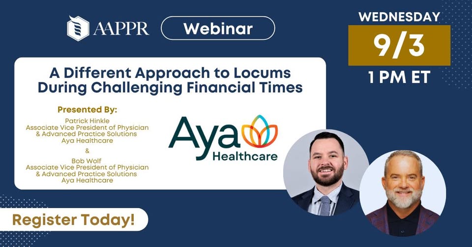 AAPPR Live Webinar: A Different Approach to Locums During Challenging Financial Times Presented by Aya Healthcare Wednesday, September 3, 2025 | 1 pm ET Healthcare leaders are navigating unprecedented financial pressure as budget constraints, restructuring and looming federal reimbursement changes heighten the need for more strategic workforce decisions. With new policy proposals threatening to shift how care is valued and paid for, every staffing investment is under the microscope — especially locum tenens, which can be seen as costly despite their critical role in maintaining access and revenue. As a physician recruiter, delivering a robust analysis of staffing costs to your C-suite executives has become more critical than ever. This session explores how to approach locums not just as a short-term fix, but as a strategic tool for protecting both patient care and financial health. Designed for physician recruiters, this webinar will offer actionable insights on how to deploy locums as a strategic resource during one of the most financially sensitive eras in healthcare. 📅 Save your spot now and get ready to transform your approach to physician recruitment. To register visit https://bit.ly/4oKhNeb (fb)