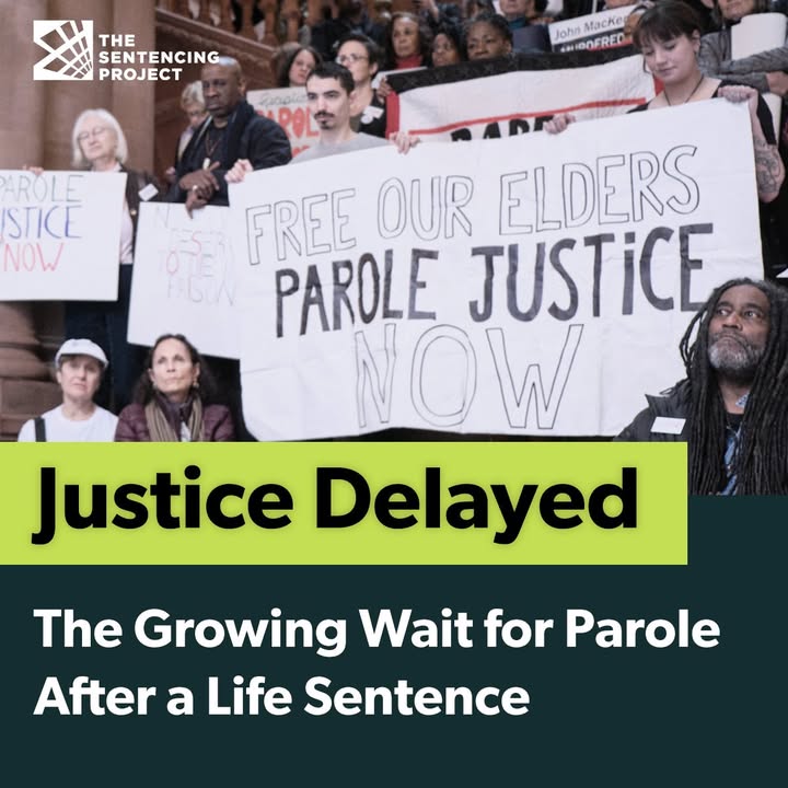 Nearly half of the roughly 200,000 people serving life sentences in 2024 are eligible for parole, but endure extended delays in the parole process – from the wait for initial eligibility to the wait for reconsideration following a denial. sentproj.org/justice-delayed (fb)