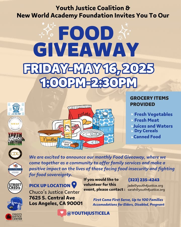 FREE CHUCO’S FOOD GIVEAWAY! 💫 Friday, May 16th from 1PM-2:30PM! 🫶🏿🫶🏽🥕🥦🍎 FEED THE PEOPLE: We continue to offer free community groceries & food drive for our local South Central communities & neighbors this Spring and Summer! Shoutout to our partners at @newworldacademyfoundation @charlesrdrewu @ybcharter helping to provide FREE: Meat 🍖 Veggies 🥗 Cereal 🥣 Water 💧 Juice 🧃 Canned Food 🥫 Contact us if you would like to volunteer! (323)235-4243 Please share widely, open to all families and ages! 🫶🏿🫶🏽 #Chucos #FoodGiveaway #YJC #NWA #SouthCentral • • • #food #justice #now #power #us #community #love #black #brown #people #losangeles #la #california #instadaily #igdaily #instamood #instalike #photooftheday #instagood #family #media #change #share #instagram #family (fb)