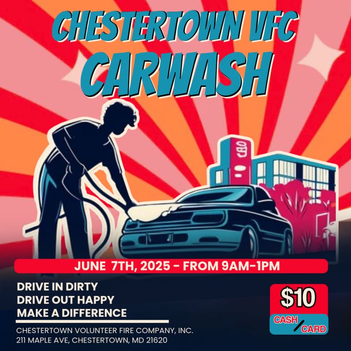 It may be raining now, but sunshine (and shiny cars) are on the horizon! Mark your calendars for June 7th, 2025 and roll through the Chestertown VFC Carwash from 9AM–1PM at the Chestertown Volunteer Fire Company, Inc. Whether you’re caked in mud or just looking for a fresh shine: Drive in dirty, drive out happy, and make a difference. Just $10 – Cash or Card 211 Maple Ave, Chestertown, MD 21620 Rain date: Saturday, June 14th, 2025 Support your local volunteers and get your car sparkling clean — see you there! (fb)